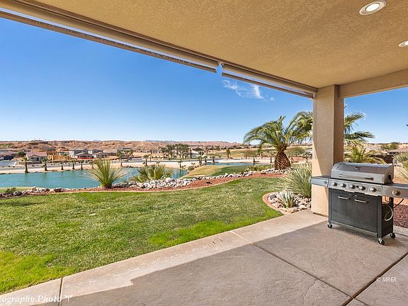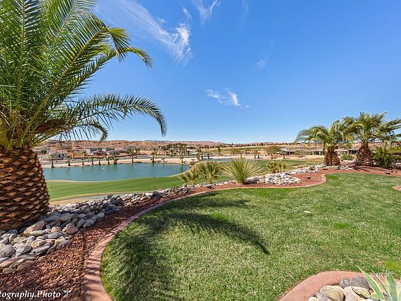 Situated high above the first fairway of the Canyons Golf Course and located in the custom home community of the Tuscans, this home opens up to breathtaking sights. This 1940 SF home is located on a premium elevated home site with expansive golf course, water and mesa views. Enjoy Mesquite's magical sunsets from the spacious back patio. A 4-panel slider in the great room allows the outdoor living space to be one with inside. Fresh interior paint and carpet make the space feel brand new. A much appreciated new HVAC was installed less than a year ago. The kitchen has a large eating bar, double roll out shelving in the lower cabinets and the walk-in pantry to die for! All appliances stay and the refrigerator is included. The dining area is wrapped by a large bay window that brings in the gorgeous sites. Both guest bedrooms and the owner's suite are spacious. The owner's ensuite host a large soaking tub and custom walk-in shower and the closet is large. The laundry room has additional cabinetry and the washer and dryer are included. Epoxy garage floor and water softener a nice bonus. SID paid in full.