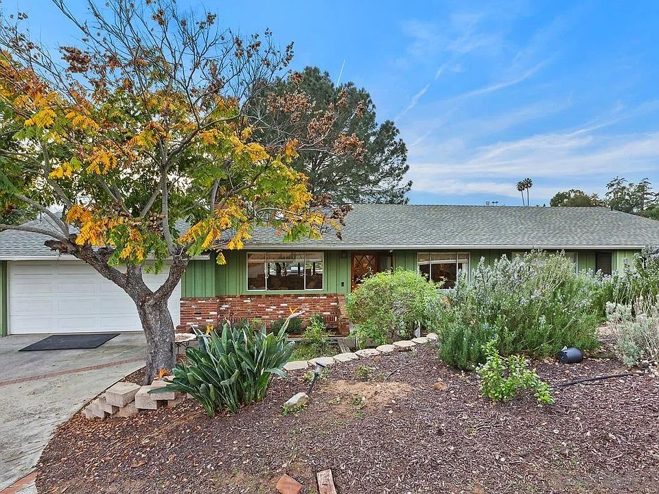 Located off of a private drive, this exceptionally curated mid-century residence sits on over half an acre of serene land, offering privacy, charm, and versatility. The inviting, light-filled living space showcases vaulted beamed ceilings with skylights, original hardwood floors, and a brick fireplace, complemented by an enclosed sunroom ideal for a home office, studio, or extended living area. The beautifully updated kitchen features Viking appliances, limestone flooring, and a zellige tile backsplash. Bathrooms offer travertine floors, custom high end finishes, materials, and fixtures throughout. The thoughtfully designed layout includes a spacious primary suite with walk-in closet, en-suite bath, in-closet laundry, and direct access to the backyard. Recent upgrades include a newly replaced heating and air conditioning system. A detached bonus structure with a full bathroom provides flexible use for guests, work, or recreation. The picturesque grounds include a private vineyard, a thriving mini-orchard with avocado, grapefruit, fig, lemon, mandarin, and orange trees, two storage sheds, and a chicken coop. Horses are permitted, and the expansive property offers excellent RV parking. A spacious carport adjacent to the two car garage functions like a third parking bay. Additional highlights include multiple electrical service upgrades ideal for shop work and EV charging. Ideally located south of Highway 78, this peaceful retreat offers the feel of country living with convenient access to nearby amenities and a short drive to the beach. A rare opportunity to enjoy space, flexibility, and a relaxed coastal lifestyle.