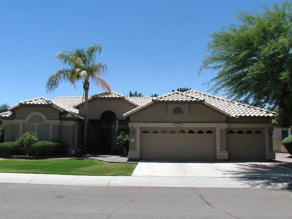 Stunning single level w/pavered walkway and entry leads to 4 bdrm, 3 full bth home w/formal dining rm and sunken living rm. This home is move in ready w/neutral custom paint, travertine versile pattern tile other than in bedrms, and master bth. Master bth offers, separate tub and shower, dbl sinks, slate tile flooring, walk-in closet and private entrance from back yard to master. Open family rm looks on kitchen. Kitchen sports newer appliances, granite counter, 42'' cabinets, pantry and built in desk off the nook. French doors from nook lead to your backyard oasis. Extended pavered patio with raised patio, grassy play area, pebble tec pool along w/above ground spa and gazebo! 3 car garage w/cabinets and workbench! And so much more, this is a must see! Chandler Schools, community park and playground nearby.