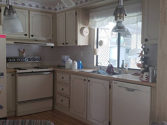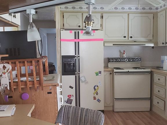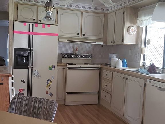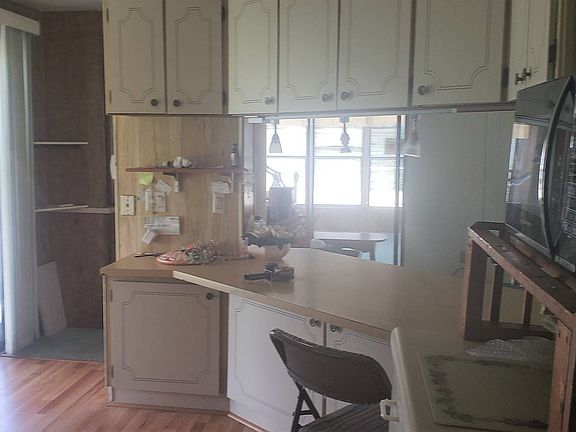 Large two bedroom two bath home located in Landmark Naples, a beautiful North Naples gated community with lot rent of approximately $800 per month. This home is vacant and ready for immediate occupancy. There was a new roof over approximately 10 years ago with a 15 year warranty. There are extra tie downs in the front and the back of the home for added stability. The exterior of the home was painted last year. The a/c heat pump is approximately two years old and the water heater is only about three months old. The kitchen and hall have Pergo laminate flooring. Two large pantries in the kitchen provide much added storage. The kitchen has an open pass through to the living room with a wide counter which stools can be placed for casual dining or work space. Dining room has a built in hutch with mirror, cupboards and drawers underneath and glass enclosed shelves overhead. The spacious living room has plenty of room for any decor, large or small and three ceiling to floor windows for plenty of natural light to shine in. and Two double sliding glass doors open to the front living area with high vaulted ceilings and windows all around. Down the hall is the master bedroom at the back which has a mirrored double door closet along with a large walk-in closet in the dressing area and a separate large linen closet. The private master bathroom has a wrap around vanity with two separate porcelain sinks and a counter separating them with room for a chair to sit at. The bathroom has a tub/shower combination with sliding glass doors. The guest bedroom is good size and has a large walk-in closet, also. Across the hall is the main/guest bathroom has an updated vanity and cabinet over the toilet and walk-in shower with built in seat and glass doors. The lanai on the side of the home has screen and glass windows for year round use. The shed off the lanai has a newer washer and dryer and utility sink. In the back part of the shed there is lots of built in shelving and work space for tools and/or crafts. The carport did sustain damage along with a small portion of the front of the lanai due to hurricane Irma. This is a good home which needs a little work to make it just the perfect home to call your own.