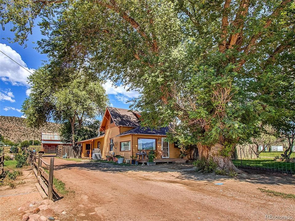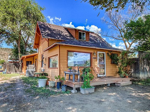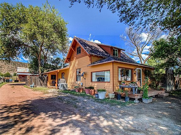 Darling home on almost 2 acres! Rare find in the heart of Canon City, no HOA or covenants. New roof, furnace and A/C! This home is move-in ready. Corian countertops in the kitchen. Open living space with large kitchen island and sitting area. Wood burning stove for cozy evenings. Main level master bedroom with attached 3/4 bath. Upstairs features the second bedroom with a loft or small den. Covered back deck with hot tub that is negotiable. Pretty landscaping and partial fencing in the backyard. Two outbuildings for animals or workshop/storage. Property is part of the Canon Hearts Irrigation Company and receives 8 shares of water irrigation. Bring your animals or toys and enjoy this peaceful property just minutes from downtown.
