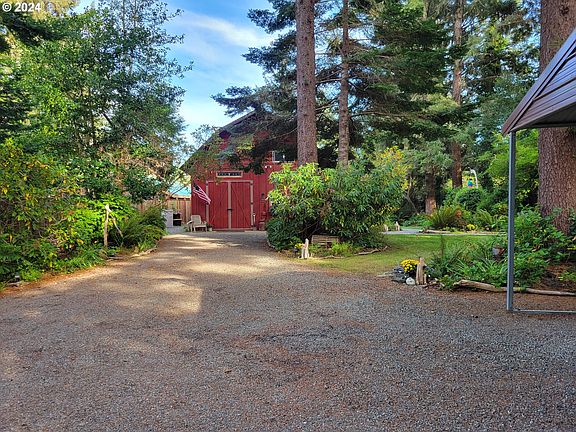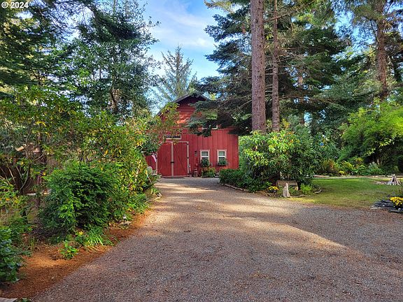 This is a lovingly rustic, converted Barn in among the huckleberries and blueberries. Oregon as it should be! Come see this 2 bedroom & 2 bath Cottage with loads of storage in the unfinished attic--anybody see a future sleeping loft? Built with open beams and custom wood touches like a western red cedar ceiling in the main bedroom. Don't miss the beautifully crafted stair rails. Open kitchen to dining and cozy living room with wood stove for rainy evenings. Second floor Bedroom with space for two Queen beds and extra loft storage. There is also a soaking tub with forest views on second level plus a walkin shower. Forested living where a gnome could just pop right out! Garden (She)Shed(6x8) and shop (he shed)(12x16) plus Steel Carport (24 x 20) for two cars & for outdoor living, RV hookups along wide driveway. Weathervanes included too! Tons of garden space with a deck for entertaining right off the dining room. Truly a unique property one block from the Southern Coos Hospital.County says lot is splitable. One mile west to City Park and Bandon Public Library, and just a bit further west is Coquille point, overlooking the Pacific Ocean (see photos), how many whales can you see? Fabulous Bird Watching too! The surf can be heard on quiet nights and even a foghorn sounding off. The back of the property has a seasonal stream that flows to Ferry Creek. Bandon is home to Bandon Dunes and Bandon Crossings World Class Golf courses. This is the little town of Cranberry festivals and a fabulous July fireworks show and some of the best weather The Oregon Coast has to offer! Don't forget to try out some of the great eateries in Old Town Bandon. The last three pictures are of the Bandon Coast, not at the property. Don't just drive by, make an appointment to see the paradise that could be yours right here in Bandon (By the Sea).