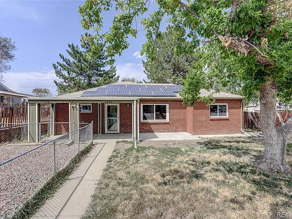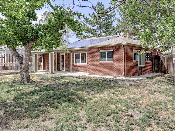 Brick ranch home with 3 beds & 2 full updated baths. Kitchen updated with Granite counter tops, travertine tile backsplash with mosaic inlay, stainless steel appliances. Oak hardwood through living room and kitchen. Ensuite master bath. SOLAR SYSTEM saves $80/mo electricity! Updated central heating and air. Window blinds. Fully fenced front & back yards. Large work shed along back alley. No HOA. Walmart Neighborhood Market store 2 blocks away. Park-n-ride bus stop at I-25. 7-min drive to WATER WORLD water park.