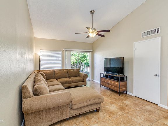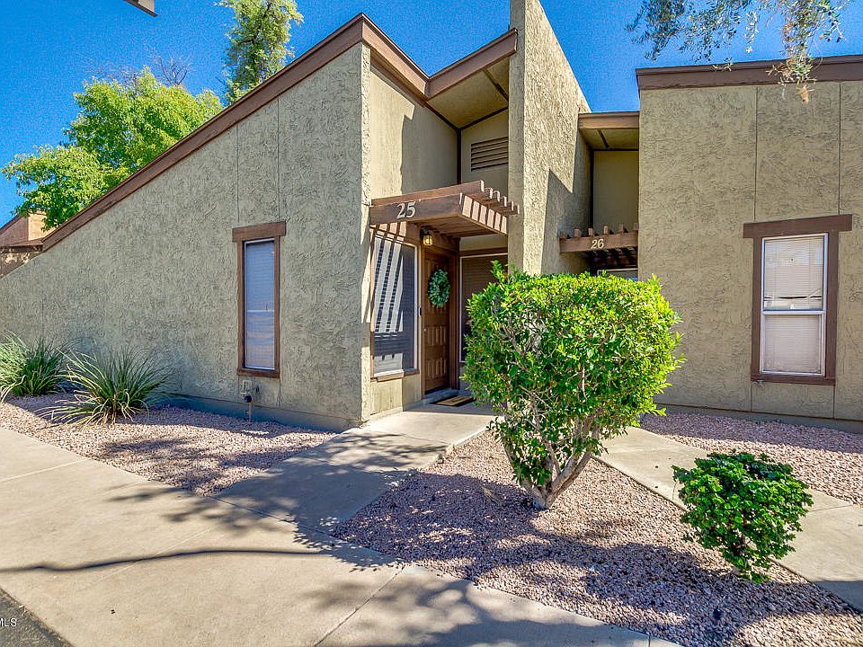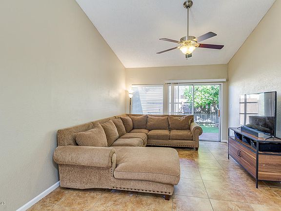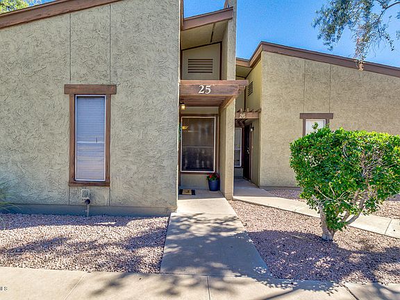 Adorable 3 bedroom, 2 bath townhome for sale in Mesa, Arizona! Soft, neutral colors for any decor and open floorplan with lots of natural light and vaulted ceilings make this home seem larger than actual square footage. 22'' tile throughout except for bedrooms. Nice size kitchen features upgraded, raised panel, spice tone cabinets, beautiful granite slab counters with breakfast bar, stainless steel appliances including flat top stove, built in microwave and refrigerator. Relax after a long day in the spacious master bedroom with walk-in closet and full bath. Perfect sized backyard with covered patio, artificial turf, fire-pit, storage shed, and citrus tree...just perfect for relaxing afternoons and small gatherings. Close to MCC, ASU, shopping, dining and US60, 101 and 202! Great location!
