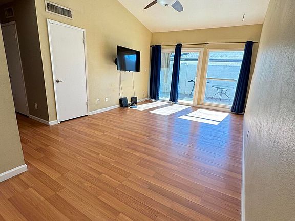Single level town home with vaulted ceilings in the living area. Stainless steel appliances, granite counter tops, tile backsplash, updated stove vent hood and soft close doors and drawers. Laminate flooring in the living areas, tile in the bathrooms. New A/C in 2021, new rear slider and window in 2021. Plenty of indoor storage space. Exterior painted in 2025. 2 assigned parking spaces, 1 is covered. Washer, Dryer and refrigerator stay. Two community swimming pools, lots of shady green spaces.