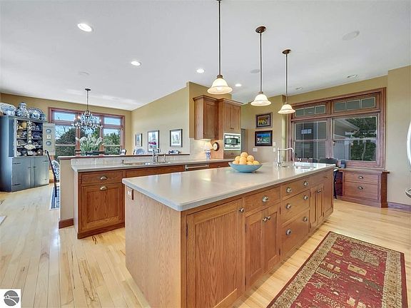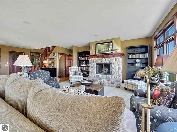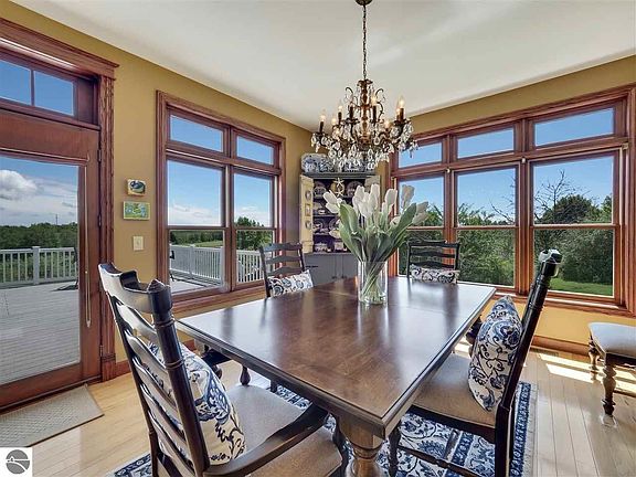 BREATHTAKING COUNTRYSIDE VIEWS will welcome you each day from this immaculate, thoughtfully designed, and well-maintained custom-built home. The 10-acre setting will delight you with 360' panoramic views. The foyer, living room with woodburning fireplace, two dining areas and a chef's kitchen with large center island flow together perfectly for entertaining. The spacious main level owner's suite enjoys spectacular views, private bath with soaker tub, in floor heat, dual sinks and walk in closet. A half bath and well laid out laundry room, with newer commercial grade washer and dryer, are just off the kitchen area. On the upper level is an expansive multipurpose area with stunning views of the property, a bedroom and full bath. A fully finished lower level has walkout areas to the gardens and back lawn, an extra-large family/media room, 2 additional bedrooms, full bath and a 14 x 22 storage area. Entertaining and relaxing amid the tranquility of your setting on the large composite deck will be a pleasure as you listen to the sounds of nature and watch the wildlife. Some of the many amenities of this home include inside and out stereo surround sound system, wine coolers and a private 22' x 27' heated office/bonus room over the finished 2-car garage. The grounds include well established perennial gardens with irrigation system, a 16' x 12' tractor shed, an additional 24' x 24' heated & insulated detached garage with workshop area. This lovely home is less than 2 minutes from Antrim Creek Nature Area with 156 acres of woods, trials, and a mile of accessible shoreline on beautiful Lake Michigan. You will love the privacy this property affords yet still just a short drive to shopping, dining, and cultural attractions of surrounding towns.
