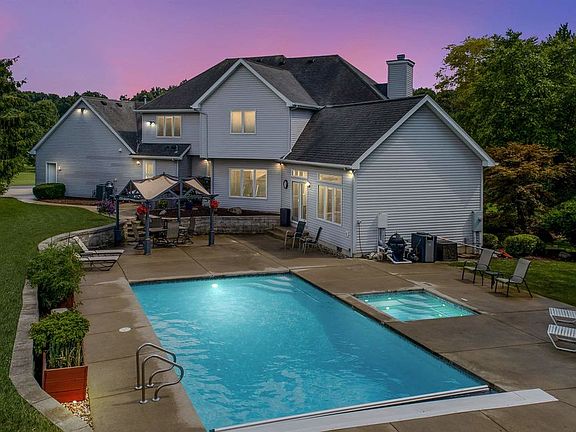 In the heart of Aboite this home offers a relaxed lifestyle amongst suburbia. This home on approximately 4 +/- acres has a fantastic location, flexibility of a rural home-site and is on the Aboite trail system. The house and approximately 4 acres on the west side of the drive way is being offered for sale including the pole barn and swimming pool. The home has several gathering spaces, formal dining room, dual stair cases and study all catering to the many functional aspects of daily living. The open concept kitchen adjoins the gracious dual living areas with fireplace and a view of the pool. The dining area off the kitchen offers a space to enjoy relaxed family meals. The ample kitchen counter space and cabinets offer storage and function as well as beautiful granite surfaces. The master en-suite has granite and marble steam shower with 6 shower heads, large closets spaces and relaxing views. The walk- out basement has granite counters, wet bar, pool table, weight room area, built-in surround sound and a guest bedroom. A stairway from the basement goes into the garage. The secluded back yard affords privacy while swimming or enjoying the outdoors sitting around the fire pit. The black top drive extends to the pole barn which has a concrete floor, electricity and a storage loft. This home has 2 furnaces, 2 air units, a 2019 navien tankless hot water heater and an updated security system; all have been well maintained. This property is on city water and city sewer.