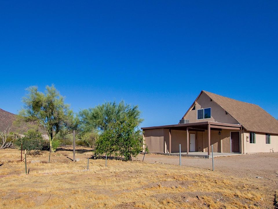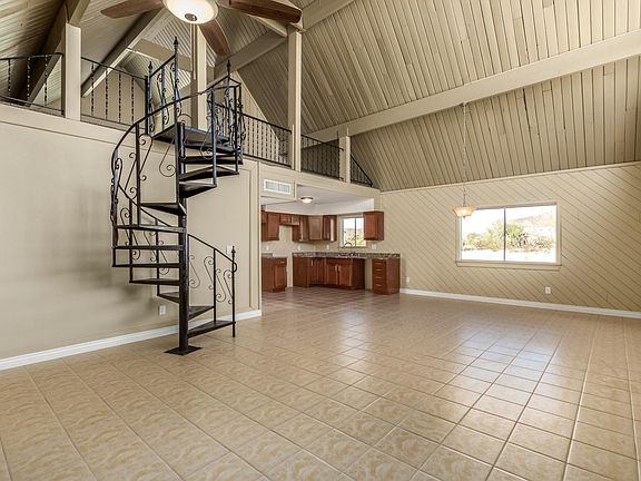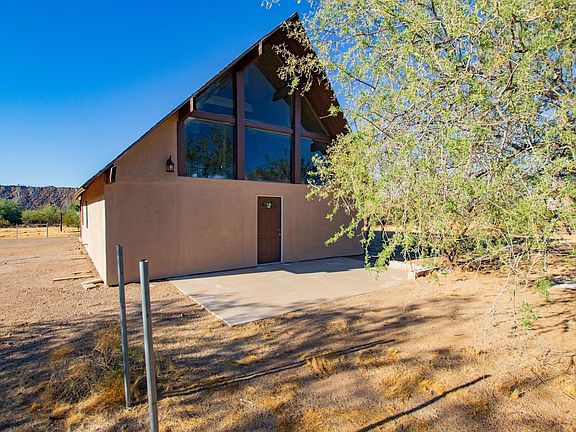 Impressive Remodeled A-Frame Home & Horse Property. Surrounded by Mountain Views & over 8 acres of land! Welcoming new interior palette, wood plank ceilings, neutral tiled floors, ceilings fans, 2-story windows, & wrought iron spiral stairway to loft. Loft could be considered 3rd bedroom (master suite). It is the only room upstairs, has closet, window, and its own bath. New wood kitchen cabinets w/stylish hardware & breathtaking views from window over the new sink. Seller will install electric range, OTR microwave, & dishwasher prior to closing. 2 Generous sized bedrooms, new plush carpet/padding, ample closets, & 2 new baths. Designer lighting, new vanities, mirrors, & fixtures. Interior laundry area in 2nd bath. Enjoy the natural desert, sunsets, & blue skies. Agent/Owner