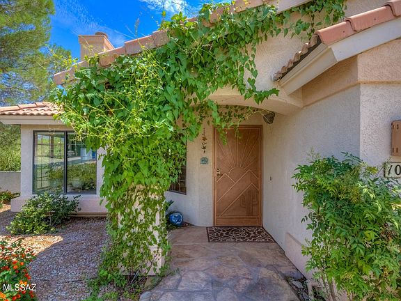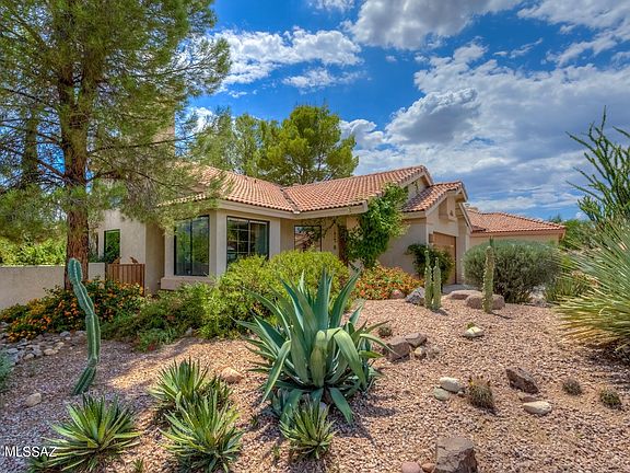 Oro Valley hilltop corner lot home with mt. views seen from patio andalmost every window...beautifully landscaped, it is convenient to stores andrestaurants. Bike or walk on the county's all purpose path system located atthe bottom of the hill. Den is a potential 3rd bdrm. Primary bdrm withvaulted ceiling measures approx. 18' x 12' and opens to the AZ room(perfect spot for a hot tub). Bright and airy vaulted ceiling living/diningroom features a saltillo tiled gas fireplace and saltillo tiled corner windowseats, a unique arched 3-D stained glass window above a low E glasspicture window. The 24'x 22.5' partially covered stone patio enjoys atiered water feature as well as misters and ceiling fan to cool you. Eat-inkitchen has plenty of cabinetry... features a 5 burner gas stove with convection, counter depth dutch door refrigerator., reverse osmosis at sink is also connected to frig. All stainless appliances. Custom shelving in garage.