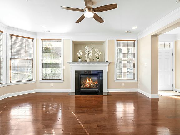 Welcome to low maintenance living, just minutes from RDU and all your favorite restaurants and stores in the Brier Creek shopping district. This bright and beautiful condo offers the utmost in convenience. No stairs into front door or from garage makes walking your dog easy in this pet-friendly neighborhood. Large windows overlook a courtyard sitting area, and you are just steps from a fire pit, pool and shared grilling area. Ample open parking in addition to your garage makes parking easy for guests. Your front door opens to a spacious, freshly painted living room with beautiful prefinished hardwood floors, a gas fireplace and lots of natural light. The dedicated dining room features wainscoting, a beautiful chandelier and more windows. Generous custom cabinets with pull out drawers surround a well-appointed kitchen. Stainless steel appliances include a new gas cooktop, refrigerator and double wall ovens. Quartz countertops and backsplash complement the bright space. Counter offers space for stools in addition to room for an eat-in kitchen table. A large primary bedroom includes a sitting area overlooking a courtyard, ceiling fan with remote, and walk-in closet. The spacious en suite bathroom features a separate shower, jetted tub and double sinks. Secondary bedroom can flex to be a sitting room, office, guest room or other. Hall bathroom with shower is convenient for guests. Only 3 minutes to Duke and UNC primary care and urgent/specialty care. Within 25 minutes of Duke University hospitals and UNC hospital systems. Home is wired for security system, including bedroom panic button.