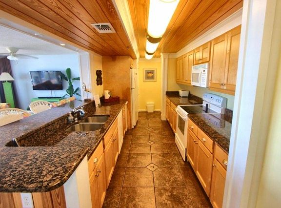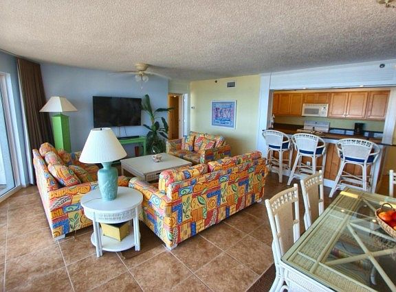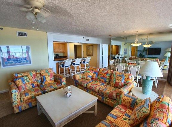 This beautiful 1769 square foot, extensively upgraded, second floor, 3bed/3bath condo is considered by many to be the best floor-plan on the beach! Property enjoys floor-to-ceiling views of the Gulf from all three bedrooms and great room that steps out to one of two large private balconies. Extensively remodeled and meticulously maintained. Conveys fully-furnished, turnkey, and rental ready. Tiled living area means easy clean-up and ultra-low maintenance. Both master bedrooms are gulf front and have access to the enormous main balcony. Both also have en suite baths that feature new natural maple cabinets, a large over sized cultured marble tub, and double vanities. Third bedroom can be converted