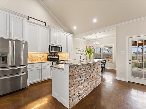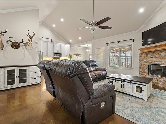 This thoughtfully designed home maximizes every square foot with a split-concept floor plan, privacy hallways to each bedroom, and ample storage throughout. The open living, kitchen, and dining area features vaulted ceilings, a stone, wood-burning fireplace, and low-maintenance stained concrete flooring, creating an airy, cohesive space perfect for everyday living and entertaining.