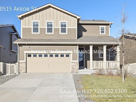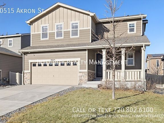 Welcome to 10515 Akron St, a beautiful two-story home located in the highly sought-after Belle Creek neighborhood in Commerce City, CO. This spacious and modern property offers everything you need for comfortable living and is available for rent at $2,940 per month, with lease terms ranging from 12 to 24 months. Interior Features: This stunning home features 3 bedrooms and 2.5 bathrooms across 1,912 square feet of living space. The open-concept layout highlights a stylish island kitchen with a dining bar, perfect for entertaining or casual meals. The kitchen is both functional and elegant, seamlessly flowing into the living and dining areas. Vinyl flooring throughout adds durability and modern flair, making maintenance a breeze. The master suite includes a spacious walk-in closet, providing ample storage space. A washer and dryer are included for your convenience, saving you time and effort. The wood-burning fireplace in the living area creates a cozy atmosphere for relaxing evenings, 18 Months Lease 24 Months Lease 2 Car Garage Ac Dining Bar Island Sprinklers Washer And Dryer Included Wood Fire Place