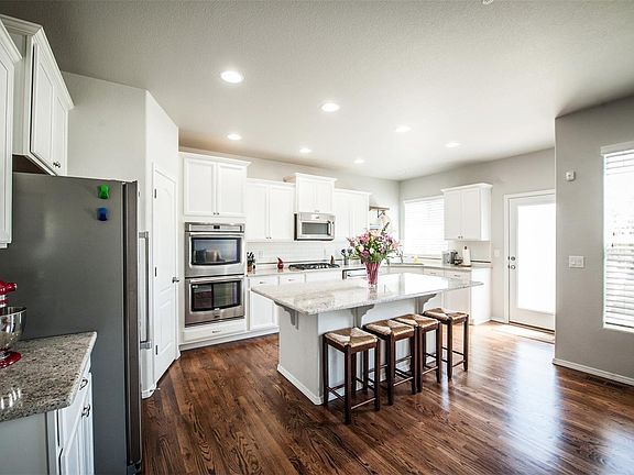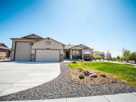 Gorgeous ranch with finished basement, 2016-built Campbell Homes Monarch with attached RV garage and Pikes Peak view! On quiet cul-de-sac, value-added upgrades include full landscaping, central A/C, window coverings, dual climate controls, fireplace, wet bar. 48ft deep RV garage accommodates large vehicles or at least 4 cars. Inside, stunning wood floors, quartz counters, 9 foot ceilings. Kitchen has stainless appliances, double oven, gas range, pantry, island, subway tile backsplash. Master bath has double sink, jetted tub, large shower. Great Pikes Peak view from office. Pre-installed solar chase, security system, pre-wire for hot tub, gas line for patio grill, pre-wire for home theatre, and CAT6 and cable throughout. Meridian Ranch has golf course, 215-acre Regional Park, and recreation center with pools.