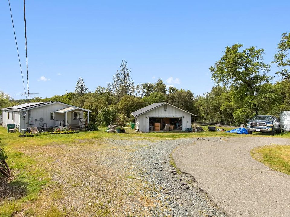 2 local country acres minutes from the corner of Hwy 49 and Wolfe Road. This is a manufactured home on permanent foundation. 2 bedrooms on one side of home, master on the other. Detached garage, sidewalk between structures. The previous owners where flower growers so there is a separate cross fenced area for your gardening pleasure. On either end of the 2 acres is a pasture and barn for your horses. Paved circle driveway, gated, fenced and cross fenced. Solar was installed in 2017, New roof installed in 2023. Seasonal pond, plenty of room for your RV and toys. Acreage is on either side of modular with fenced area for gardening, animals.