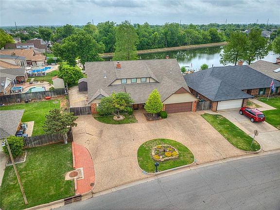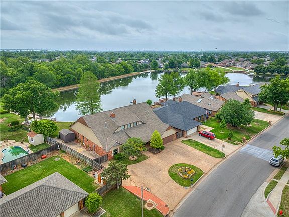 This beautiful LAKEFRONT home was the original builder's personal residence. Wonderful open floor plan with two very large living areas, both with fireplaces. The split floor plan with one bed, bath, and living area on one side of the house would lend itself to a variety of different living situations. The large main bedroom has a huge bath/closet area with a walk-in storm shelter! There are two other beds and a bath in this wing of the home. A wonderful sunroom on the back of the house features a cocktail bar with seating for 5-6. Enjoy your view of the lake while having a drink! There's a formal dining area w built-in hutch, as well as eating space in the kitchen, which has a pantry and granite counters. A gated side area w/concrete pad for a vehicle, boat, etc. The dock & deck are less than a year old, gables were recently replaced, and most of the windows replaced 5-8 years ago. Enjoy lake living in the heart of the city in this spacious, flexible home.