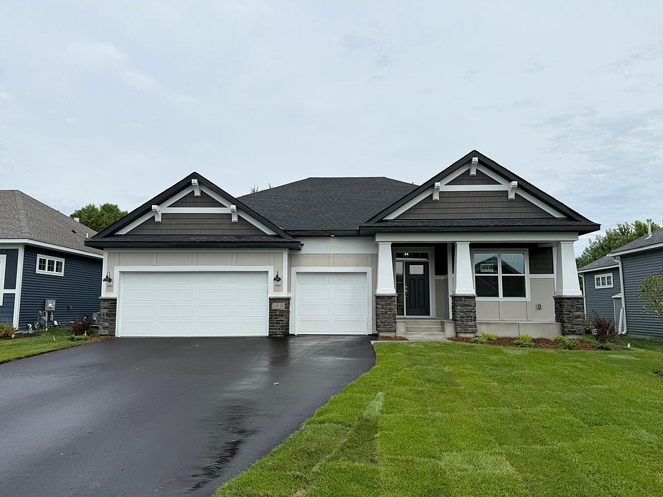 The Langford home features an array of exterior options to get the look you want. This craftsman-style, single-story home offers a standard 3-car garage so you can have a spacious third stall for a workspace, a third car, or a summer boat. Featuring a spacious covered entry, the Langford has the kind of curb appeal you'll love. Sitting at 2,938 square feet, this 3-bedroom, 2.5-bath home has plenty of space to move about. Entering through the front, a spacious foyer with double closets sits adjacent to a den area, perfect for a home office or craft area. Heading to the back of the home, you'll be impressed with the optional vaulted ceilings, optional railing to open up the staircase, and optional decorative, arched soffits throughout. This home showcases character and charm, beginning with the decorative art niche, which is an excellent spot to showcase a gorgeous vase or decorative accent piece. The main-floor laundry room acts as a mud room and leads into the open-concept kitchen, which showcases a large center island and convenient corner pantry. The main-level owner's suite has an optional tray-vault ceiling and an attached bathroom with an oversized walk-in closet. The lower level serves as an extra living space, thanks to its recreation room, multi-purpose flex space, 2 additional bedrooms, and bathroom. The lower level in this home is the perfect setup for visiting in-laws or guests.