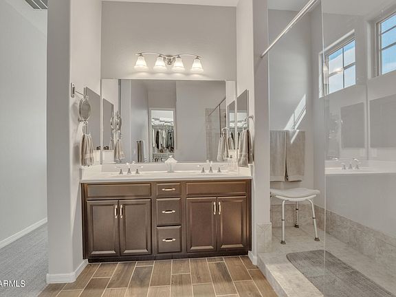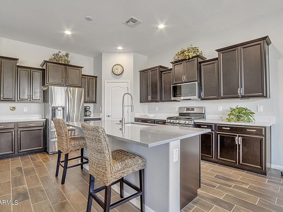 Discover this charming single-story home in the highly sought-after Eastmark community in Mesa, AZ! This residence is designed with comfort and style in mind, offering an inviting atmosphere with ample natural lighting and elegant wood tile flooring throughout the open living area.