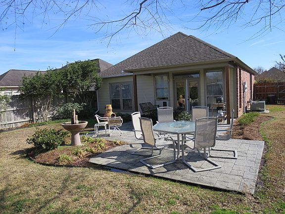 Wonderful open floor plan with many windows for lots of natural light. Large patio, great for entertaining. Mature landscaping in front and back, with sprinkler system in front yard. New roof and A\C. Entire exterior newly painted. Stained and scored concrete floors, custom faux wood blinds and ceiling fans throughout. In-ceiling surround sound in living room and ventless gas fireplace. His and hers sinks and walk-in closets in master. Jacuzzi tub with separate shower in master bath. Included with house: Washer and dryer, fridge, garage work bench, patio furniture set, chiminea, swing bench, and fountain. Ceramic tile spacious counter tops in kitchen, great cabinet and storage spaces. New stainless steel appliances! Access to neighborhood clubhouse, pool, playground, basketball and tennis courts. Move in ready and priced to sell!