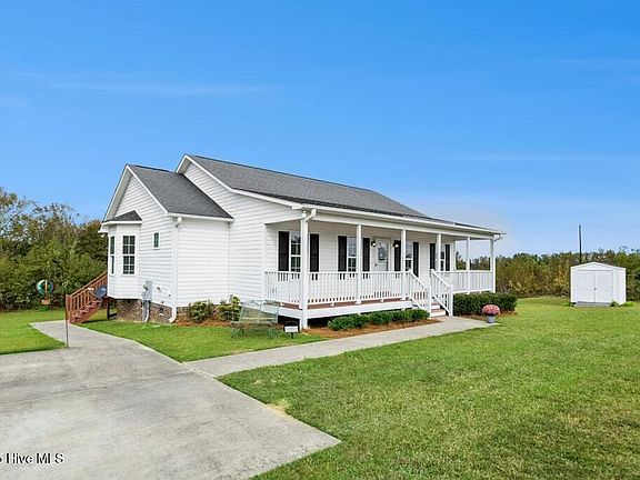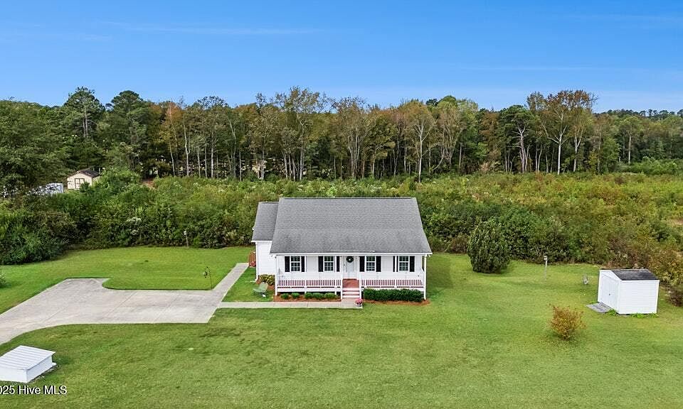 Welcome home to no subdivision and no HOA — situated on just OVER an ACRE of land. Enjoy plenty of parking with an extended driveway and additional parking pad that lead to a SPRAWLING covered front porch, perfect for relaxing evenings. Step inside to find ELEGANT flooring that flows throughout the family room, creating a warm and inviting space. The kitchen features an eat-at bar, abundant cabinetry, and included appliances (stove, counter microwave, and dishwasher). The adjoining dining area showcases a charming bay window overlooking the side yard and provides access to the covered back porch — ideal for entertaining or enjoying your morning coffee. A large walk-in laundry room with custom PANTRY shelving adds convenience and functionality. The primary suite features ELEGANT flooring, a spacious walk-in closet, and a private ensuite bath with a SOAKING tub, SEPARATE shower with built in seat, and a large vanity. Connected to the primary bedroom is a flexible BONUS space — perfect for an office, nursery, hobby room, or sitting area. On the opposite side of the home, a secondary bedroom and full hall bath with vanity and tub/shower combination complete the layout. Outside, you'll find stairs leading from the COVERED back porch and a detached storage building for all your outdoor needs. Welcome home