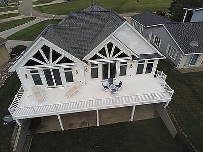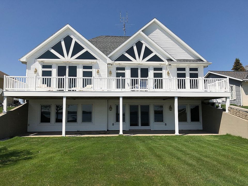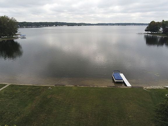 Breathtaking views of Lake George are enjoyed from almost every room. Delight in the full house-width low maintenance deck with 2 remote-controlled awnings on the main level & covered cement patio on the lower level. Both look onto 90 feet of prime lake frontage with a sandy beach. The main level includes 2 master suites with full baths & one has a private office with spectacular views of the lake just as the living and family rooms do. Baths feature a jetted tub/shower, a walk-in shower, & a traditional tub/shower. The gorgeous kitchen has quartz countertops & backsplash, custom cabinets with roll out shelves & pantries galore. The foyer is enhanced by diagonally-laid porcelain tile. There are 18 closets (4 are walk-in), 6 individually designed tray ceilings & 2 cathedral ceilings which add beauty, interest, & spaciousness, a large dining room, & custom cabinetry throughout. The walk-out lower level features a kitchenette/bar, great room, game room, 3 bedrooms, full bath, & a huge storage room area which could provide even more baths & bedrooms. An attached, oversized 2 car garage with shelving adds even more storage space. Being located very close to I-69 & the Indiana Toll Road (80-90) makes it convenient from Ft. Wayne, Indianapolis, Toledo, Cleveland, Detroit, & Chicago.