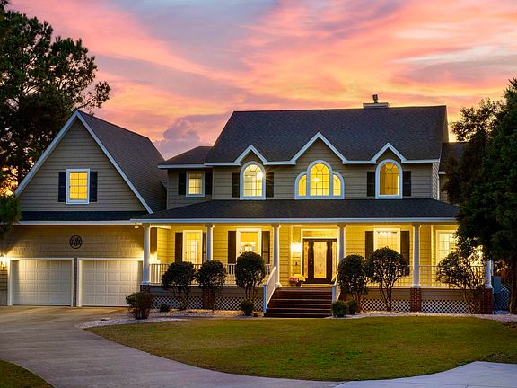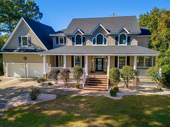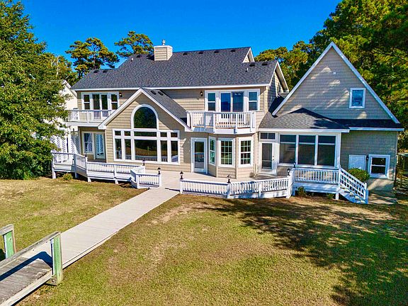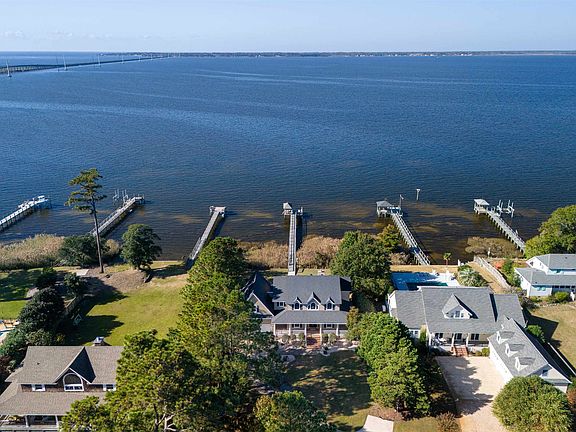 Sunsets & sensational water views from nearly every room steal the show imploring a state of instant tranquility from this beautifully-maintained coastal home. Located in one of the most sought-after gated communities this 1.25 acre parcel features a .10 mile meandering drive through lush peaceful landscape perched in subtle seclusion on the beautiful Currituck Sound. A chandelier-graced vaulted foyer immediately captivates with water views and the Great Room's wall of windows welcome you to a gracious flow of living spaces. A formal Dining room, lovely home office and open-concept floor-plan with eat-in Kitchen and counter dining spaces accommodate a large family and entertaining with ease. Take solace in single-floor living with special features abound such as cathedral ceilings, gleaming hardwood floors, cozy gas fireplace, custom cabinetry wet bar, powder bath and a recently renovated Primary bedroom suite with gorgeous ceramic-tiled shower and soaking tub. You'll wake to water views with access to expansive waterfront decking. Kitchen features custom maple cabinetry, granite countertops, double ovens, countertop range with Jenn-Air grill, two center islands, walk-in pantry, table and counter dining and smartly re-imagined refreshment area with new refrigerator, wine cooler and wine rack grace the main floor. You'll cherish morning coffee and sip on evening beverages from special niche spaces like the perfect enclosed sun porch, welcoming front porch, quaint sound-front nook, large waterfront deck and covered gazebo perched on the 170 ft private pier perfect for sunset and osprey-watching. The home's open essence is carried through on the second floor with 3 additional bedrooms, 2 of which are waterfront with private balconies. One expansive ensuite bedroom with soaking tub, separate tiled shower, immense storage and pull-down attic which spans the length of the house plus two bedrooms with shared jack-and-jill style bath. Another fantastic living feature is the home's additional Recreation Room/Den located over the large 2-car garage. While easily accessible from the home's main Living space, it also offers a private entrance should you choose to fashion it as separate living quarters Suite/Game room/Gym or home office with its own private bath. Exceptional amounts of storage throughout home and in garage with impressive wall configurations, two 600 lb. capacity ceiling-suspended adjustable VERSA RAC units, all which convey with sale. Martin’s Point amenities feature 24/7 security at the gated entrance plus private marina with boat ramp and slips, multiple stocked fish ponds, playgrounds, a waterfront pavilion for hosting gatherings plus boat/trailer storage. Be sure to take advantage of your coveted residency by joining the community's yacht club and take part in the best of coastal offerings with fun social gatherings, kayak outings, sailboat racing, holiday decor contests, and more! Listing photos have been virtually staged with furnishings. An extensive list of recent years home improvements include a hurricane fortified roof, 105' of heavy-duty vinyl bulkhead, new paver parking pad, Pier lighting, new mini-split and HVAC heat pump units, Drain field, carpeting, appliances and more- see enclosed for complete list of details and dates. This home has a special grace all its own with major home components well-cared for and upgraded beckoning for your new personal touches.