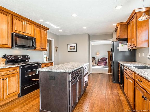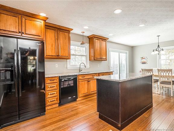 A warm and inviting walk-out basement ranch home with a touch of country living. Beautiful four bedroom, three full bath home in The Oaks Subdivision, Floyd Central/Highland Hills Schools. Remodeled large kitchen with custom cabinets, granite counter tops, large pantry and huge laundry room. The kitchen features a new sliding door to the deck and french doors to the deck from the master bedroom. Warm and inviting living room with a fireplace and a wood stove in the walk-out basement family room that will keep the whole house cozy all winter long. Beautiful large lot within a neighborhood with established trees.