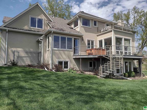 Welcome to 1052 Pebble Beach Drive, a majestic haven situated along the serene banks of the Missouri River in Dakota Dunes, SD. Offering an exquisite blend of elegance and comfort, this custom-built 2-story home is an oasis of luxury. Step inside and be greeted by stunning panoramic views from every window, framing breathtaking sunrises and sunsets that paint the sky. With 6 bedrooms, 4.5 baths, and over 7470 sq ft of meticulously crafted living space, this residence is designed to cater to your every need. The open-concept layout is perfect for hosting gatherings, featuring three fireplaces including a magnificent wood-burning fireplace adorned with floor-to-ceiling stonework in the living room. Entertain with ease in the gourmet kitchen, complete with stainless steel appliances, a breakfast bar, a dry bar, and a walk-in pantry. Work from home in style in the executive office, complete with built-in shelving and access to the deck. Retreat to the lower level for relaxation and entertainment, where you'll find a spacious family room, game room with a pool table, additional bedroom, bath, and wine room. Outside, soak up the tranquility of riverside living on the decks or unwind in the hot tub, surrounded by the beauty of nature. With a four-car garage, geothermal heating, and meticulous maintenance by its sole owner, this home is ready for you to move in and make it your own. Don't miss your chance to experience the epitome of luxury living in Dakota Dunes. This meticulously maintained home, will only one owner is being sold in its current condition. Additional rooms are Second floor bedroom 14x13, basement with family room, 17x29, game room 24x21, 3/4 bath 9x5 bedroom 12x14. Additional parcel 23.GC.08TR00D included w/property