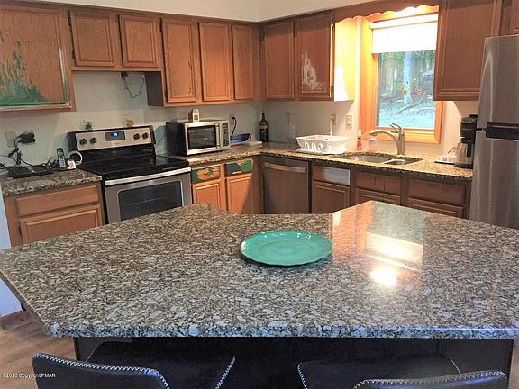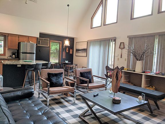 Contemporary Chalet in Secure Gated community. Home offers large living area with cathedral ceilings, floor to ceiling windows, fireplace, upgraded kitchen with granite counter tops, island overlooking living area, tons of cabinets, Large Main bedroom with private master bath with whirlpool tub and double sinks, loft/family room overlooking living area, huge wrap around deck, new roof and new exterior paint. Tons of amenities which include ski slope, chair lift, outdoor and indoor pools, restaurant, fitness center, indoor tennis, drop off garbage area AND still close to Pocono attractions lke hiking, golf,shopping,horsebacking and rive adventures!