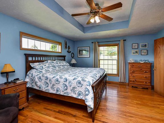 Enjoy the scenery from the covered front porch of this beautiful home with over 3,400 sq feet, 3+ acres and a 30x36 outbuilding! The oversized eat-in kitchen comes with 2 pantry's, island, and tons of cabinets. The main floor has 2 bedrooms, main living area, and formal dining. Head downstairs and you will find an additional 3 bedrooms and a second living area. The downstairs has a pellet stove and a walk out basement to a covered patio. Outside you will find the large 2 door outbuilding and a fenced off area for horses or cows. Home is heated with an electric heat pump with propane emergency auxiliary heat. Be sure to check out the attached oversized two stall garage.