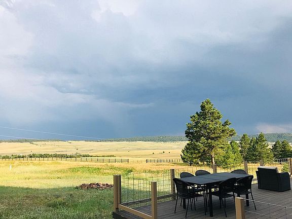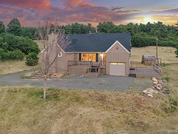 Take a break from city living and own your own slice of the Great Outdoors! This 5-bedroom, 4-bathroom home sits on 2.5 acres of horse-zoned land, only 10 minutes from Monument, CO. The home features THREE wood decks, two Master Suites, a sunken living room with wood-burning fireplace, beautiful ceramic tile floors in the kitchen/dining area, and fully finished basement with 3 more bedrooms, guest bath, and large laundry room. This property borders Spruce Mountain Ranch, providing endless views, and includes a chicken coop and private well. 2019 upgrades: New carpet, interior paint, light fixtures, recessed lighting, ceiling fans, LVP floors, solid doors, deck paint, vegetable garden raised beds. 2020 upgrades: fully replaced roof to come.