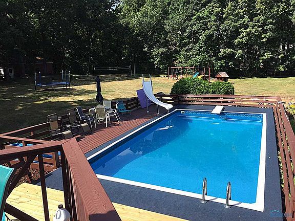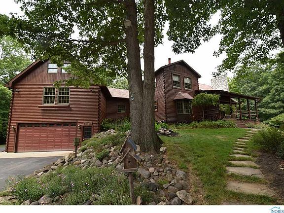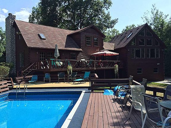 Custom log home on a private wooded retreat w/ trails* House features spiral staircase, walkout lower level, wet bar, cathedral ceilings, ceramic tile & hardwood floors & Anderson windows* Newer roof, hot H2O tank, fireplace insert w/ remote & pool carpet* 2 tier deck overlooking the 16'x32' 8 ft deep pool* Lots of storage in heated garage w/ epoxy floor & 24'x32' pole barn w/ concrete & electric!