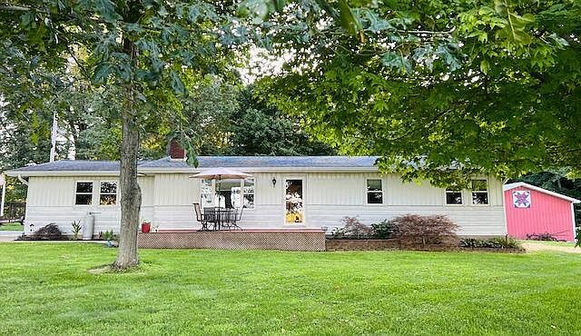 Enjoy gorgeous views of the countryside in this Ranch style home beautifully situated on 1.42 acres with mature trees and landscape. The updated, custom kitchen has an abundance of cabinetry, under cabinet lighting, ample counterspace and is open to the dining/office area that offers great natural light with the sliding glass doors leading to back deck with retractable awning. Other features include an extra spacious primary bedroom, double sinks in the bathroom, hardwood floors, interior french doors, built-ins and gas fireplace in the living room. A 2 1/2 car attached garage plus a 24X40 pole barn/garage are perfect for storage of your vehicles, ATVs and equipment. The full basement offers an additional app. 1300 Sq Ft of storage and potential living space for app. 2644 Sq Ft. in total