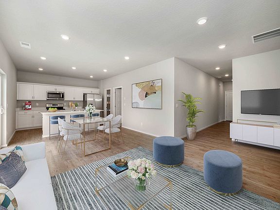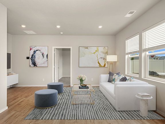This Sierra is a modest single story home featuring an oversized pantry, shaker cabinets w/modern pulls, light toned quartz counters in the kitchen & stainless steel appliances. Reclaimed wood look laminate flooring in common areas & the bedrooms come with soft, cozy carpeting for those cold mornings! The primary bedroom is located at the back of the home overlooking the backyard & features an en suite bath w/ walk in closet. Built to the most recent codes w/ a heat pump for heating and COOLING! Our smart home package is also included, video doorbell, keyless front door entry, programmable thermostat. Z-wave switch, Echo Dot & Qolysys IQ panel is the central hub which talks to all your smart home devices whether at home or not! Front yard landscaping includes irrigation. Very convenient location, just 12 mins to downtown!