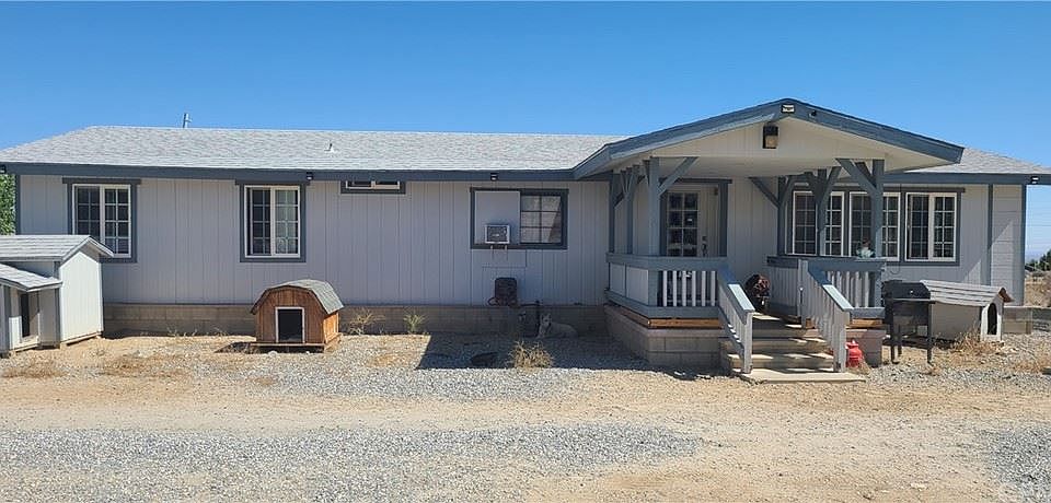 Adorable Manufactured home on a permanent foundation. Three bedrooms, 2 baths, detached 3 cars garage all insulated with 920 square feet 10 feet tall. Horse barn plus 3 storage buildings and basketball course set up for NBA distant 3 point shooting 23 feet. Approximately 1 mile West of paved Smoketree rod and just north of Hwy 138. Beautiful views and lots of space for horses and toys. Come and take a look, this home is waiting for you. This home had big lot Approx 2 ac. The house had been upgraded from 100amp to 200amp. Previous approved for online retail home business. 5 banners cooktop had been replaced with child safety features. Seller motivated.