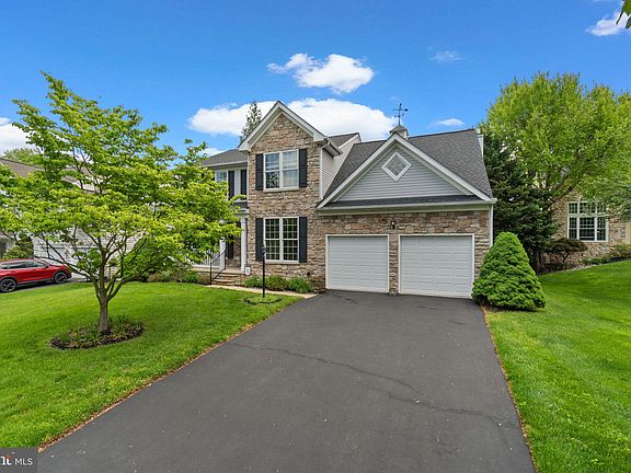 Impressive stone-accented Colonial lovingly maintained by the original owners and situated on a cul-de-sac in the prestigious Waverly Woods community with scenic golf course views. A welcoming front porch and lush landscaping set the tone for the charm and elegance found throughout the home’s interior. Step inside to a grand two-story foyer with hardwood floors, a convenient powder room, and a private study just off the entry. To the left, the sunlit and spacious formal living room flows seamlessly into a formal dining room adorned with a bay window, chandelier, and classic chair railing—perfect for hosting special occasions. The eat-in kitchen is well-equipped with an island, a built-in writing station, a pantry, generous cabinet and counter space, and a cozy breakfast area with access to the deck. The space opens effortlessly into the family room, featuring a dramatic floor-to-ceiling stone gas fireplace that serves as a beautiful focal point. Upstairs, the home offers a spacious laundry room, four comfortable bedrooms, and two full bathrooms. The opulent primary suite includes a large walk-in closet and an en suite bath with a dual-sink vanity and a private water closet. One secondary bedroom boasts two closets, while another features a walk-in closet. The finished lower level provides a large open recreation room with decorative molding, a powder room, and an exercise room with luxury vinyl plank flooring and walk-up access to the backyard. Outdoor living is just as appealing with a Trex® deck, a paver patio, and a flat, open green yard framed by mature landscaping and trees for added privacy—all backing to fairway #5 of the Waverly Golf Course.