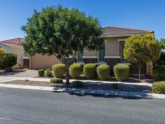 Welcome to your gorgeous new home in booming S.E. Mesa. Brand new carpet. Upgraded kitchen with stainless steel appliances, expensive cabinets, white quartz countertops, unique hand-crafted faux brick walls, and a gas stove top; unique living room off the entry with painted ceiling and crown molding to impress guests at first sight; stone-decorated gas fireplace and coffered ceiling in the spacious family room; every bedroom in the house connects with a full bathroom; large plank wood-look tile throughout the home; tall, modern baseboards; low-maintenance yard: wall-to-wall artificial turf! Alumawood pergola for additional shade. Enjoy 3 epoxied garage spaces with storage above and a full-house RO and soft water system. Enjoy Eastmark's amenities including a neighborhood diner, fishing pond, skate park, playgrounds, volleyball, basketball, baseball, great park with event pavilion, community pool and splashpads, and much more!