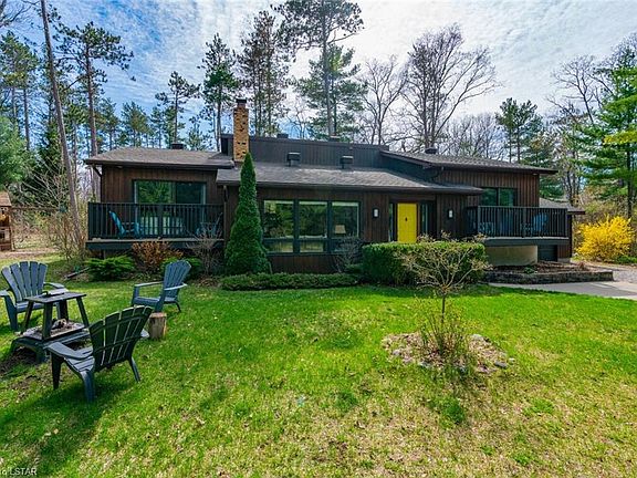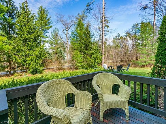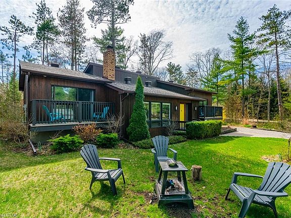 Charming cottage in Huron Woods, 0.53 Acres nestled amongst the vast Carolinian forests with lots of privacy and plenty of room for indoor and outdoor entertainment. Surrounded by nature & wildlife this home is only a 5 min walk to the deeded private & exclusive sandy Beach O' Pines shoreline. This property is only 600m from the Pinery Access point and trail. Main floor of this home offers high vaulted ceilings with skylights. Beautiful yellow brick surround wood burning fireplace in the living room. 3 Bedrooms with 1.5 baths on the main floor. Kitchen and dining overlooking the living space, with the dining room having patio doors opening up to a large 3 season room (approximately 24'x12'). Primary room and the second bedroom each have a private deck overlooking the front of the cottage. Lower level is Fully finished and offers a spacious rec room with gas fireplace along with two large bedrooms & 3pc bathroom. Some updates include: Painted throughout, screened-in three season room rebuilt in 2020, new privacy fence in the back 2020. New Luxury vinyl plank floors in 2019, main bath vanity 2019, new light fixtures 2019, Gas dryer 2019. (natural gas BBQ hookup at back patio). As part of the association fees the owners have access to expansive clubhouse area with tennis courts, playground, canoe storage & so much more.