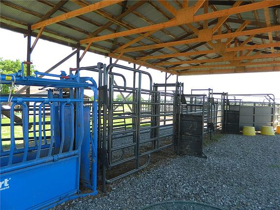 Pristine 155 acre working cattle farm w/2 ponds, 2 wells that have never ran dry with waterlines to 3 Mirafount livestock waterers. Covered new Priefert squeeze chute, PBR rodeo style corrals, panels, and 28 ft adjustable alleyway with slide gates.3 pole barns, hay/equipment storage all on paved county hwy. Electric on site. Rural water at street. Option to purchase cattle. No dwelling, grand views. Listing agent related to seller.