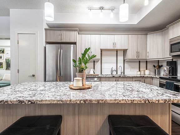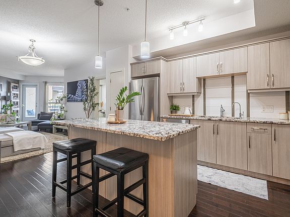This stunning 1 bedroom +DEN condo perfectly blends luxury & comfort. Ideal for professionals or downsizers, this home is nestled in one of the city's most vibrant communities. Step into a space that exudes sophistication! The gourmet kitchen is a showstopper, featuring Valhalla granite countertops, an eat-up island, sleek custom backsplash, & premium stainless steel appliances—all designed to inspire culinary creativity. Rich hardwood floors flow through the main living area, complementing opulent finishes & the open-concept layout. Enjoy central AC in summer or unwind on the serene, glass-railed balcony. The huge primary suite offers luxury vinyl plank flooring, a massive walk-through closet & a 4pc ensuite w/ elegant fixtures & generous counter space. A spacious den, in-suite laundry & underground parking add to the ease of condo living. Enjoy the building's rooftop patio—perfect for entertaining & taking in sunset views. Impeccable home in a prime location. This isn't just a condo—it's a lifestyle!