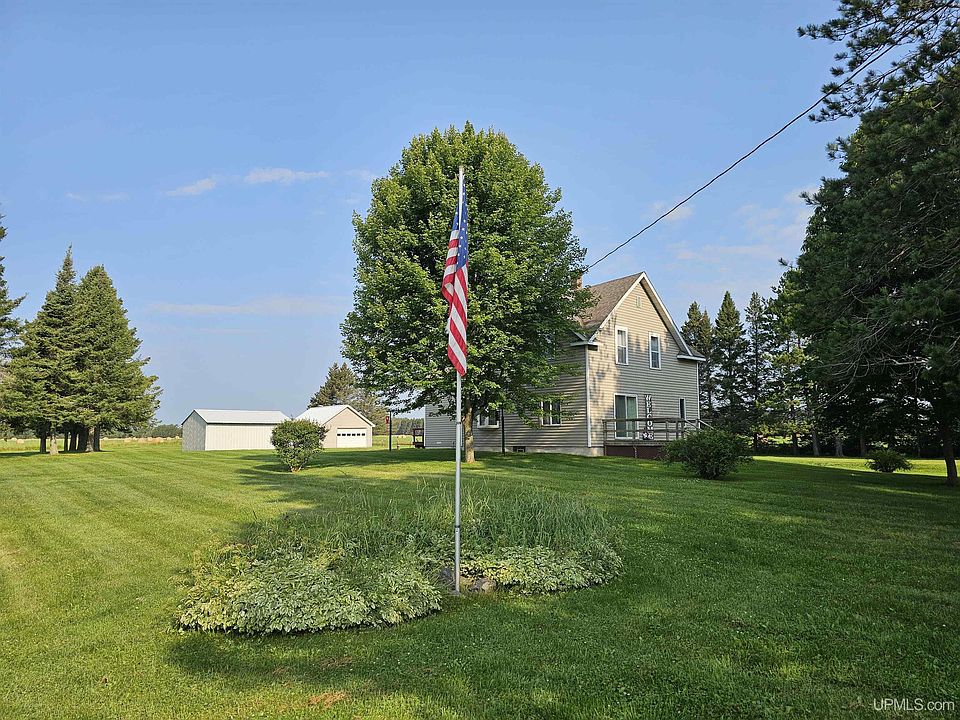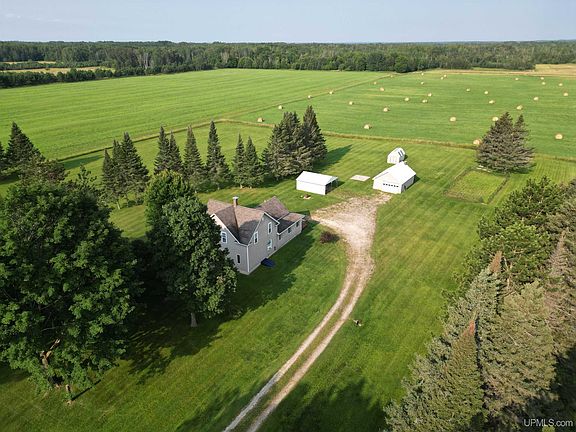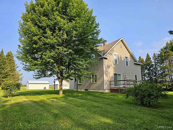 This charming 1900s, 2-story farmhouse is ready to be yours! Modern meets rustic in this carefully remodeled home that still boasts historic charm. As you enter through the back door, you'll find an expansive entry hallway, perfect for kicking off your work boots and storing jackets. Just before entering the kitchen, there's a huge walk-in pantry. The remodeled kitchen features expansive cupboards & plenty of counter space for baking and cooking. The main level also includes a laundry room, remodeled bathroom, formal dining room, living room with a slider to the front deck, and a bedroom with an attached office. Upstairs, you'll find four additional bedrooms, all with ample closet space for storage. The roof, hot water heater, septic tank, and some floor coverings have all been replaced within the past 10 years. Situated on 3.8 acres, the property is surrounded by farmlands and offers great potential for incredible garden space. There is a detached 2-car garage, a 2-car pole barn with two completed sides, and a storage shed. Centrally located near Nahma, you'll be halfway between the major cities of Manistique and Escanaba. Don't miss the opportunity to make this unique property your own!