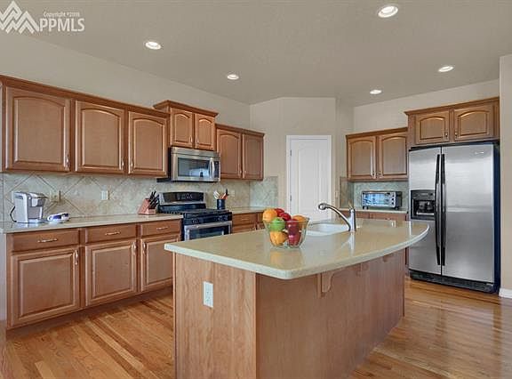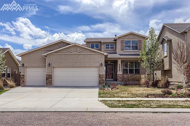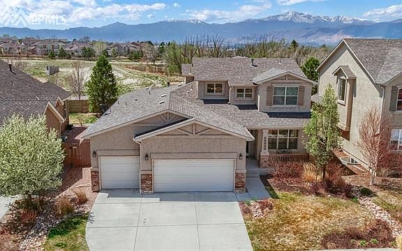 Beautiful and lovingly maintained home in D20 w/ main level master and breathtaking views of Pikes Peak and the front range! The main level is true open-concept with large windows showcasing the Colorado mountains and skyline! Wood floors lead into a front office and gourmet kitchen with a large center island, stainless steel appliances, Corian countertops and an adjacent dining area with a walk-out to the wood deck and backyard! The great room has a stunning gas fireplace with stone surround to enjoy in the colder months! The main level master with it's spa-like en-suite is sure to be a true retreat after a long day! His and her walk-in closets, tile flooring, double vanities, a soaking tub and a walk-in shower! A large laundry room and powder room complete the main level. The upper level features a secondary junior suite with a walk-in closet and private bathroom, 2 more bedrooms, a loft area and another full bathroom with double vanities! The finished basement provides so much additional living and storage space! There is a 5th bedroom and another full bathroom and another room that could easily be made into a 6th bedroom if needed! The entire property is professionally landscaped and the fully-fenced backyard is the place to enjoy outdoor fun! Enjoy watching the sun set over the mountains on your private wood deck! Just a few additional features this home offers is a 3-car finished/insulated garage with built-in shelving, a radon mitigation system, A/C, upgraded carpet, and window treatments. Come take a look today and fall in love!