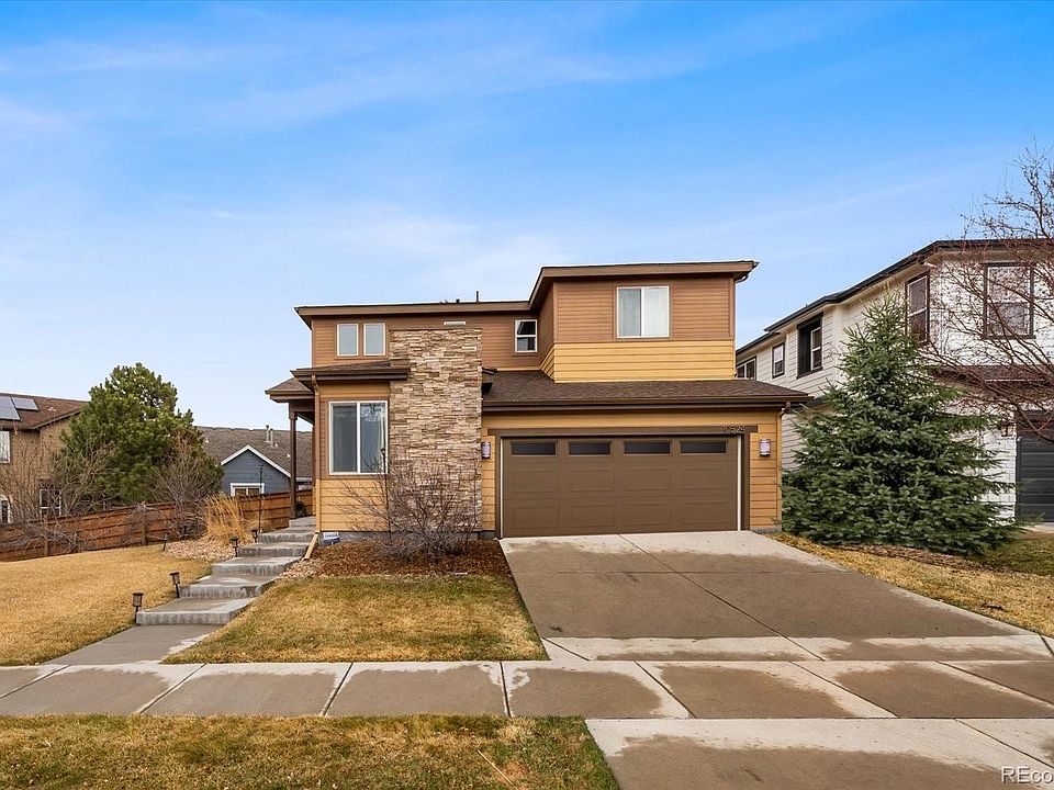 Stunning & spacious home with one of the largest lots in the community! Ample outdoor space for gardening, entertaining or simply enjoying a Colorado sunset. Its xeriscaped design ensures low maintenance landscaping and water conservation with minimal upkeep. Boasting 3 bedrooms plus a main floor office, 3 baths and room to expand. Upgrades galore throughout this beauty, ensuring a modern and stylish living experience. The grand, open floor plan creates a sense of warmth and connectivity, while also allowing natural light to flood the space. All appliances included: washer, dryer, kitchen refrigerator, deep freezer (basement). Stroll just a few steps away to Reunion Park & Coffee House at the end of the street! Trail system winding through 8-miles of lakes! Enjoy outdoor yoga or a refreshing workout at the neighborhood community gym/fitness rec center. Reunion comes complete with 2 pools, outdoor athletic courts, an abundance of area restaurants & retail. You won't want to miss movie night at the amphitheater or a round of golf at Buffalo Run. With an easy commute in every direction, this property offers convenience for daily & business travel. Whether you're headed to work, study, or simply out for a weekend adventure, this home's central location makes getting there a breeze. Schedule a showing today to experience the charm & comfort of this Reunion gem firsthand!