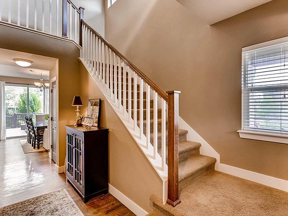Meridian Village beauty on corner lot on street with only 5 homes! Sit on the wrap-around front porch or relax on the back deck surrounded by mature trees. This 4 bedroom house is rare for these Meritage built homes. Extended hardwood floors gleam from the entry into the kitchen and great room. Gas stove and stainless appliances complement the cherry finished cabinets with plenty of storage. Custom paint gives this home a modern feel. 5 piece bath and walk-in closet with custom shelving system complete the master suite. 3 more bedrooms round out the top floor. Perfect if you need a private office. Gorgeous stacked stone fireplace with beautiful mantel provides a focal point in the great room. 9 ft ceilings in the basement are perfect for your finishing - rough in plumbing is already in. Washer/dryer stay for your convenience. Pool/playground/park community with walking trails - close to I-25, E470, light rail and Downtown Parker.