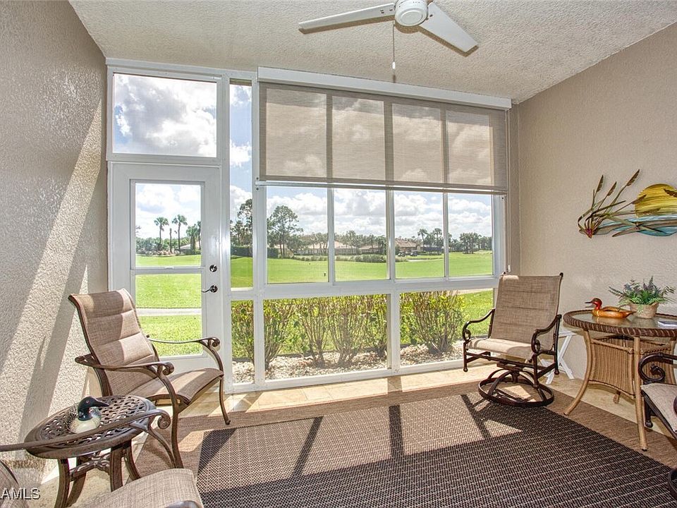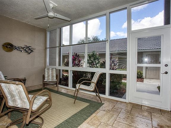 This one-of-a-kind veranda is truly a gem, offering both elegance and functionality with updates and decor you’ll love. Both lanais feature beautiful travertine stone flooring and enclosures, adding extra square footage that lets you enjoy golf course views all year round. The kitchen has been thoughtfully remodeled with new cabinetry, sleek stainless-steel appliances, stone countertops, and a neutral tile backsplash, creating a space that's both stylish and highly functional. Every detail in this home shines, from the immaculate carpet and tile to the contemporary, negotiable furnishings. Designer fans and fixtures complement the decor. With southern exposure, this home is filled with natural light throughout the day, perfectly highlighting the golf course views from every angle. The main bedroom is a spacious retreat with two updated walk-in closets and a beautifully redesigned ensuite bathroom. Hurricane-rated windows provide peace of mind and additional durability. The guest room and den offer easy access to the kitchen and share a second, fully redesigned bathroom. This condo’s location is ideal, within walking or biking distance to the clubhouse, making it easy to enjoy all of Heritage Palms' amenities. Plus, the one-car garage offers extra storage space for a vehicle, beach gear, and bikes, making it the perfect home base for an active, resort-style lifestyle.