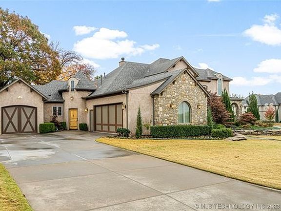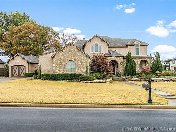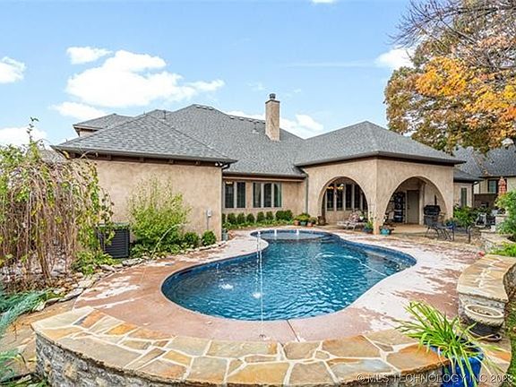 Luxury home nestled in the coveted gated community Fountain Ridge / Jenks schools, custom built by Brian D. Wiggs and loaded with extras! Large kitchen with oversized kitchen island, built-in seating bench, soft close cabinets & drawers, Aqua water filtration system throughout, see-thru fireplace, two bedrooms down, +office, wood shutters & blinds added 2021. Flex room, great design with separate garages, beautiful hardwood floors, a newly finished room upstairs 2019/second living area, or playroom. With high ceilings, the main floor is designed for most living areas. The backyard oasis includes a Gunite pool (pool company JP Construction). Pool completion date 5/2019 includes two color LED lights, two bubblers, and two fountains with cool decking. Plus an outdoor fireplace and room for entertaining. approx .5 acres, -Move in ready.