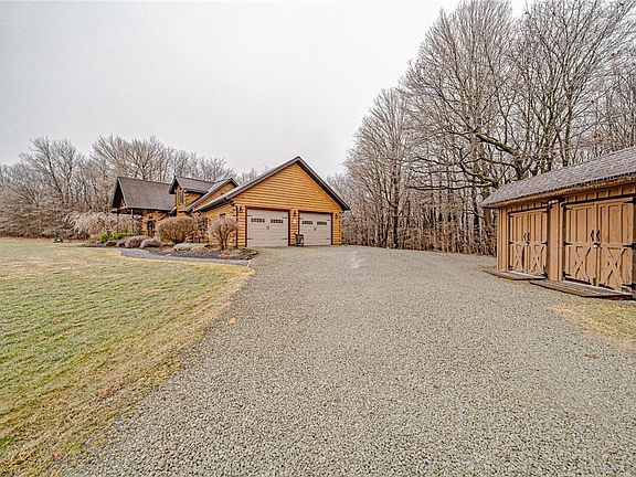 Move right in to this spectacular log home on 15+ private acres. Open concept layout w/ cathedral ceiling, gorgeous woodwork & a show-stopping 20 ft stone fireplace. The kitchen boasts hickory cabinets & plenty of counter space, a breakfast bar & stainless steel appliances. Main floor master suite w/ clawfoot tub & walk-in closet. Upstairs there are two bedrooms & a loft w/ plumbing available for another bathroom. You’ll love the finished lower level, which features a game room, gas fireplace, wet bar, 3/4 bath, additional bedroom & bonus room. The lower level would make a great in-law suite. The oversized 2-car garage leads into the main floor laundry/mud room. Outside, you’ll find an enormous deck, relaxing hot tub, & tree-lined backyard.