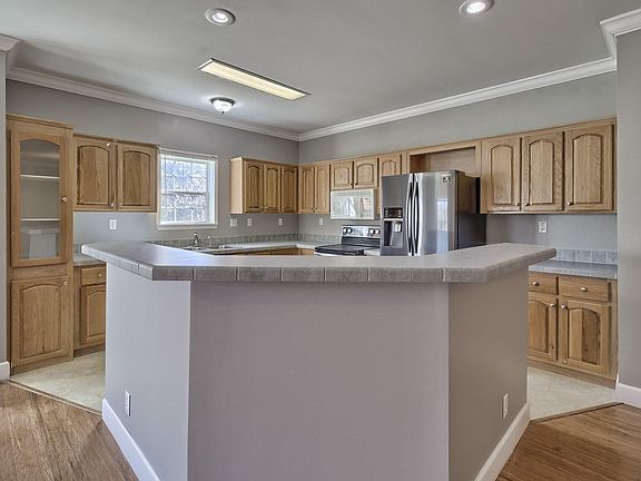 - RoomKitchenFeatures: Recessed Lighting, Tile Counters, Counter Tops-Formica, Floors-Vinyl, Cabinets-Stained, Bar