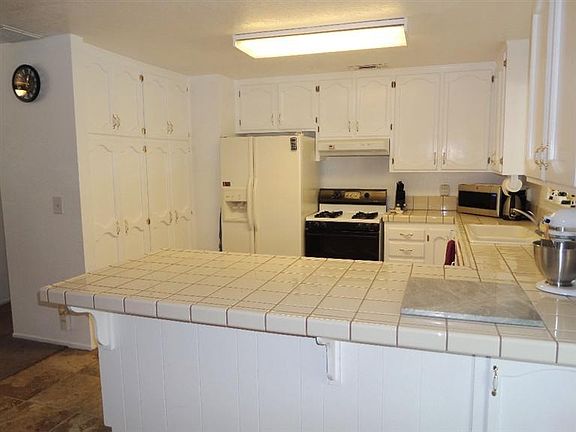 Custom Built Acreage Home w/Detached Garage!2.5 acre fenced lot surrounds this one of a kind home.Brick & stucco front exterior; covered entrance has etched glass front dr & side window. Large tiled front entry has huge walk-in storage closet! Step through the open doorway into carpeted family rm; two lighted ceiling fans & wall of bookshelves.Hallway leads to two guest bedrms. Open living,dining &kitchen; wood stove in livingrm. Tiled flooring in dining/kitchen & sun/laundry rm. Kitchen has wall of storage cabinets; sealed burner gas range; dw & tiled counters and breakfast bar; doorway off dining area leads into large sun/laundry rm w/slider to covered patio. Hallway off the living room leads to two guest rms; tiled guest bath w/soaking tub; master bedrm has lighted fan & attached bath; vanity w/solid surface; shower. Eave mounted Mastercool; two covered patios at back of home. 28' x 24' 2 car detached garage. Mature pines and fruit trees; Pines and Oleanders @ fence perimeter.