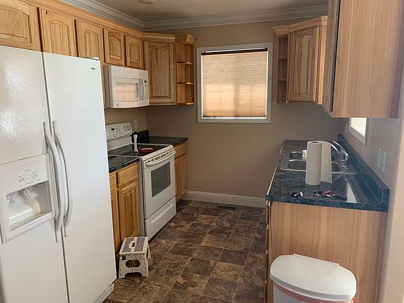 Built in 2009 this beautiful 2 bedroom 1 bath home has good quality wood cabinets, crown molding, steel siding, covered entry, all appliances including, a dishwasher, side-by-side refrigerator/freezer, range, and microwave fan hood. Also includes a 12 x 20 shed with garage door leading to alley, sprinklers, two car driveway, air conditioner, and budget blinds.